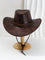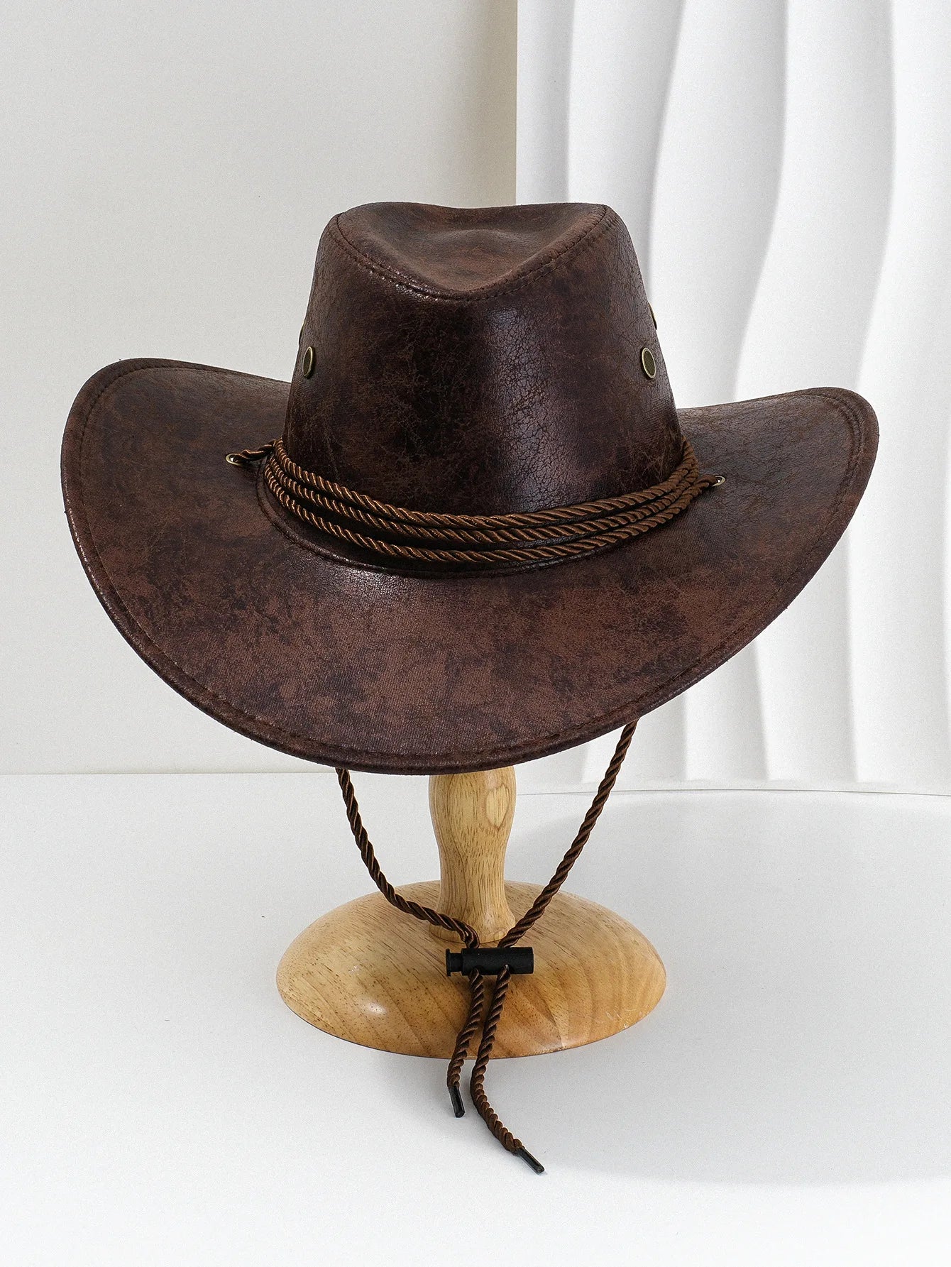 This men’s cowboy hat features a wide brim with curved edges and stitched trim along the outer edge. The crown has a shaped top with creases and two round side eyelets, reflecting a western style profile. A braided cord band wraps around the base of the crown at the side. A matching chin strap extends from the sides and includes an adjustable slider. The cowboy hat displays a textured surface finish across the crown and brim.