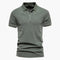 This men’s polo shirt features a polo collar with a three-button front placket. The sleeves are short with stitched hems. Side slits are visible at the lower hem. Visible stitching lines run along the placket, sleeve edges, and hem. Side slits are present at the lower hem. This polo shirt has a straight cut with seam lines.