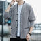 This men’s cardigan features a V-neckline with a button front closure and long sleeves. The front includes multiple round buttons and two horizontal welt pockets with contrasting trim. Ribbed detailing appears at the cuffs and hem, while the surface displays a textured knit pattern. The interior reveals a plaid lining visible along the inside opening.