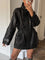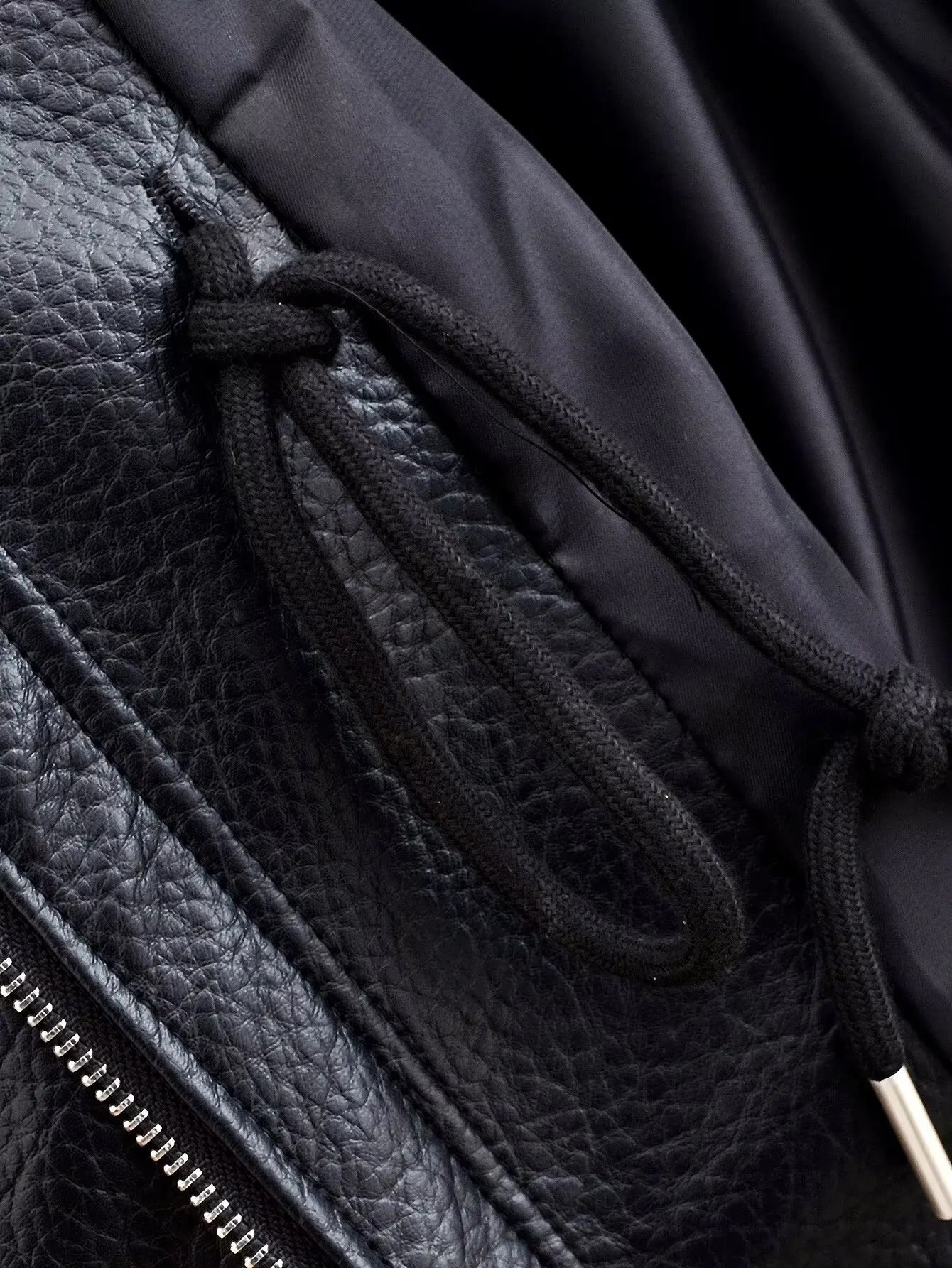 This women’s leather jacket features a front zip closure concealed beneath a snap-button placket. The neckline is finished with a stand collar that extends upward from the front panel. A drawstring detail is positioned at the waist, creating gathered sections along the midline. Two large patch pockets are placed at the front below the waist seam. The long sleeves include adjustable cuff tabs with snap accents.
