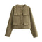 This women's bomber jacket features a circular rib-knit collar and a vertical row of circular buttons centered on the front. The garment has long sleeves that terminate in matching rib-knit cuffs at the wrist openings. This item for the female gender displays a cropped hemline that sits at the waist and includes a wide rib-knit band. Two slanted welt pockets are positioned on the front panels near the bottom edge. The surface exhibits a uniform matte color with tonal stitching along the shoulder and side seams.