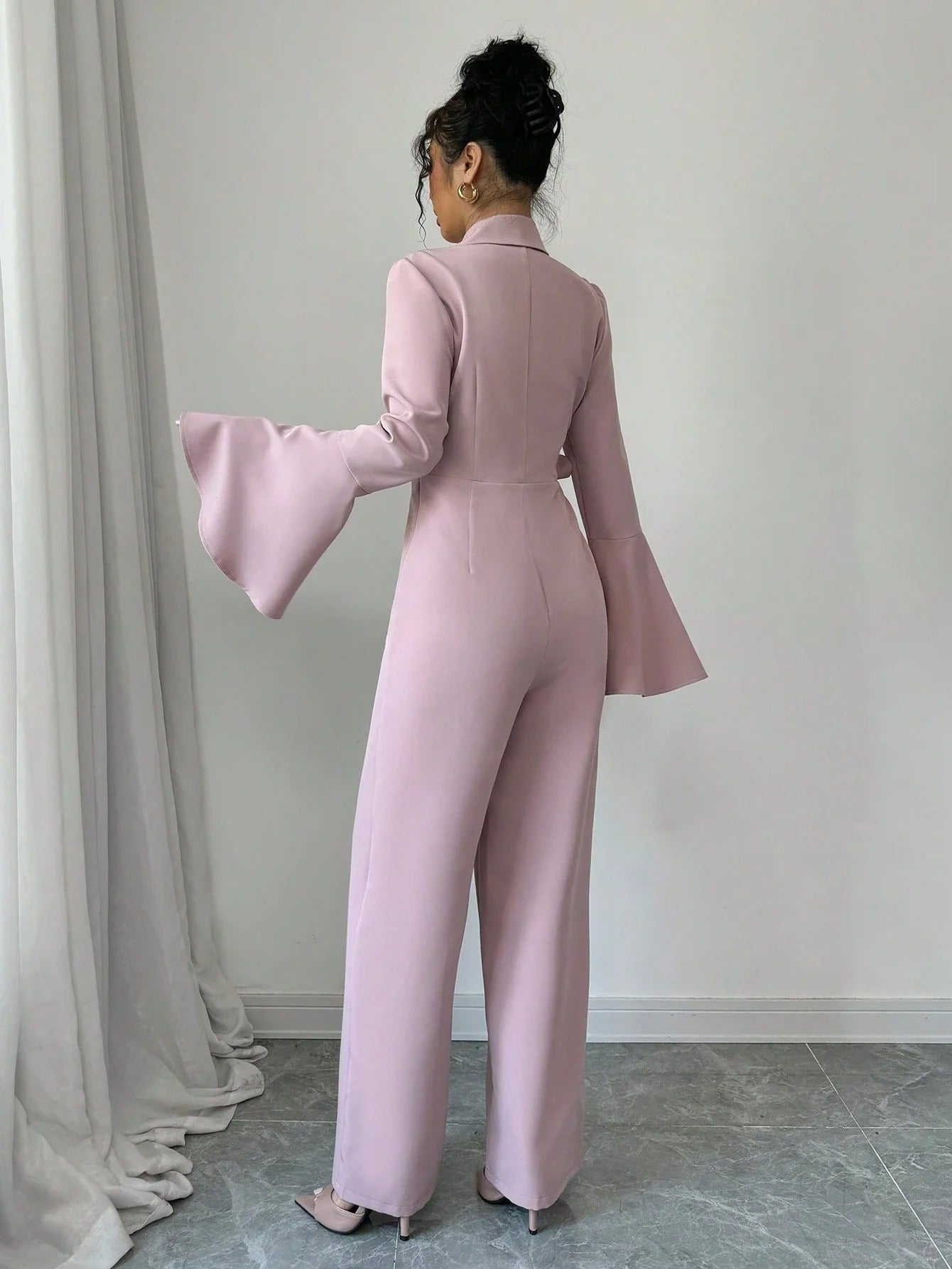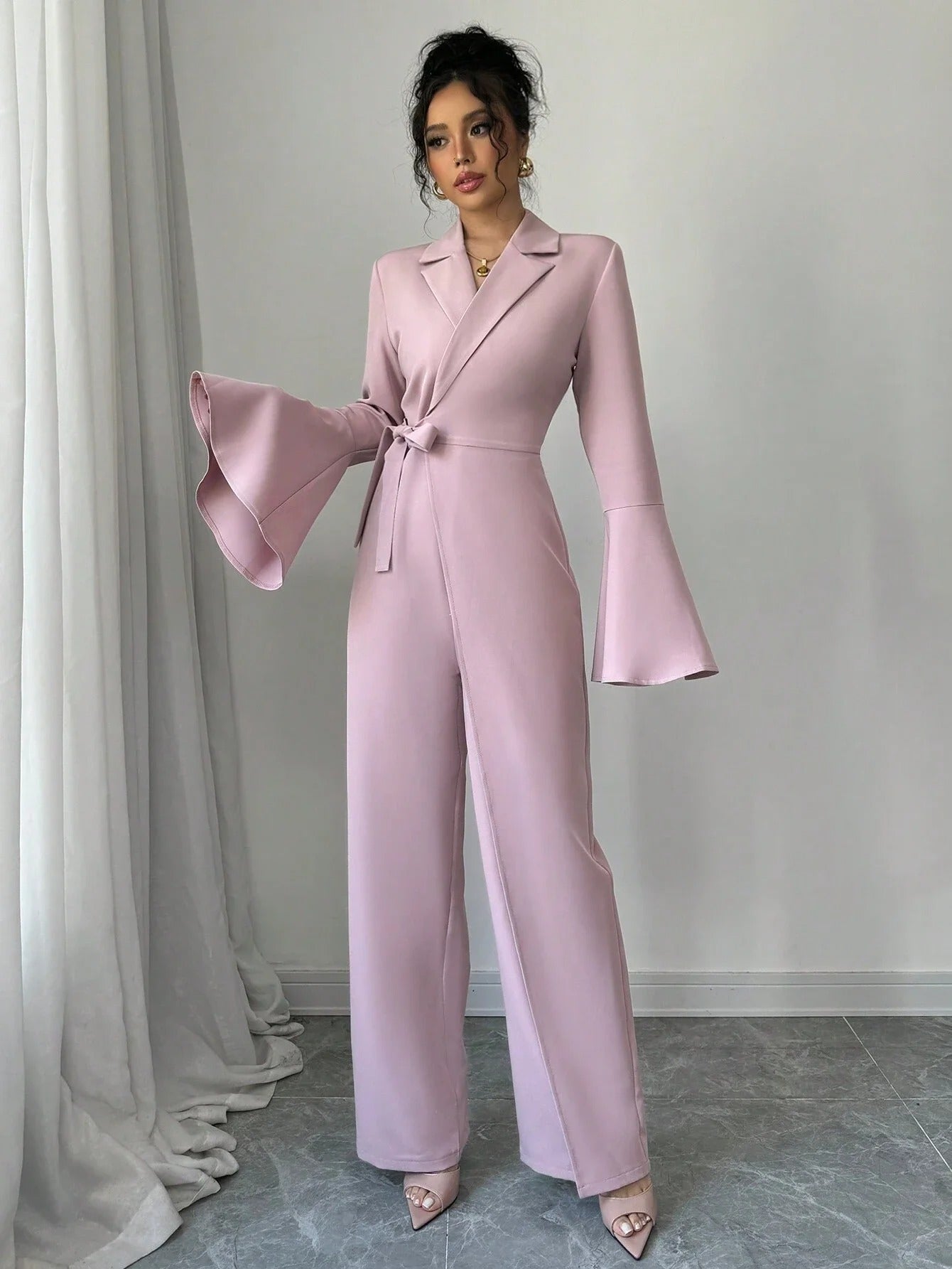 This women’s jumpsuit features a blazer-style wrap front with notched lapels and a V-shaped neckline. The front panel overlaps diagonally and ties at the waist with a matching belt. Long sleeves extend to the wrists and widen into flared cuffs. The lower portion transitions into full-length wide legs with a straight finish.