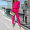 This women’s jumpsuit features a round neckline with a small front notch opening. The top includes short sleeves with folded cuffs and a loose upper section that extends over the midsection seam. A self-tie belt is positioned at the waist. The back shows a centered zipper closure running vertically from the neckline downward. This jumpsuit transitions into full-length tapered legs with a straight hem.