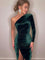 This women’s dress features a one-shoulder neckline with a single long sleeve on one side. The surface shows gathered detailing along the waist and hip area. A side slit extends upward from the hem. The skirt falls to a midi length below the knee. This one shoulder evening midi dress has an asymmetrical upper section and a column-style lower portion.