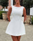 This women’s wedding guest dress features a sleeveless upper section with a boat neckline trimmed with small bead details along the edge. Vertical seam lines extend from the neckline down the front surface. The skirt is cut in an A-line shape and ends above the knees, forming a mini length. The back shows a low scoop neckline with a centered zipper closure. A large bow detail is attached at the back waist area of the wedding guest dress.
