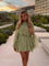 This women’s summer dress features a round neckline with gathered detailing at the front. The sleeves are long and finished with layered ruffle panels that create a flared shape. The waist area shows gathered seams that separate the upper section from the skirt. The hem falls above the knee in a mini length.