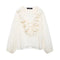 - Trim: Gathered ruffle detailing along the neckline and front edges.