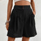 This women’s shorts feature a knee-length Bermuda cut with a straight hem. The front shows pleats extending from the waist area. A front closure with visible buttons is present at the center. The back displays a gathered waist section, and side pockets are visible along both hips.