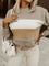 This women’s knit sweater garment features a horizontal color-block pattern across the chest and arms. A thick white stripe sits above a tan or black section, bordered by wavy textured trim. The neckline is circular with a vertical ribbed pattern that matches the wrist cuffs. Long sleeves extend to the hands and show a dropped shoulder seam. The lower portion of the torso returns to the base grey-beige color found at the top.