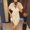This women’s swim cover up features a V-neckline at the front and back. The short sleeves extend to the upper arm. An open crochet pattern forms horizontal bands throughout the piece. A wide ribbed section appears at the midsection. The length falls above the knee with a scalloped hem.
