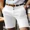 This men’s shorts feature a button-front closure at the center front. The design includes a mid-thigh length with straight leg openings. Side pockets are visible on both sides, with the openings aligned along the front seams. Belt loops are present around the top edge.